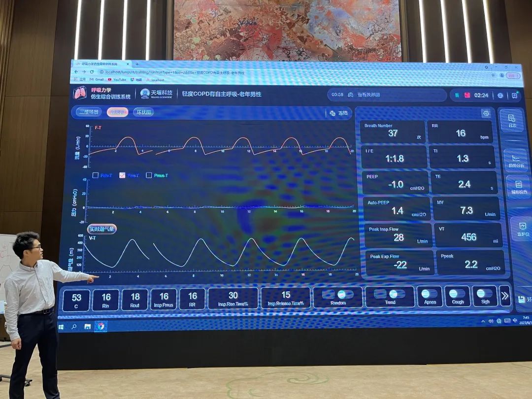 在本次会议中,来自天津医科大学总医院的李晨主任在讲授主旨为“呼吸机基本操作”的论坛讲座时,使用乐鱼网页版-乐鱼(中国)官方的“模拟肺”模拟了“复苏后自主循环恢复,无自主呼吸”、“重症肌无力患者,有较多自主呼吸但不稳定”、“肺炎,自主呼吸较强且稳定”、“创伤后呼吸困难3天,确认为ARDS”等多种不同疾病状态下患者的呼吸运动变化,结合真实呼吸机操作时的即时动态反馈,达到了很好的授课效果并收获了现场的一致好评。